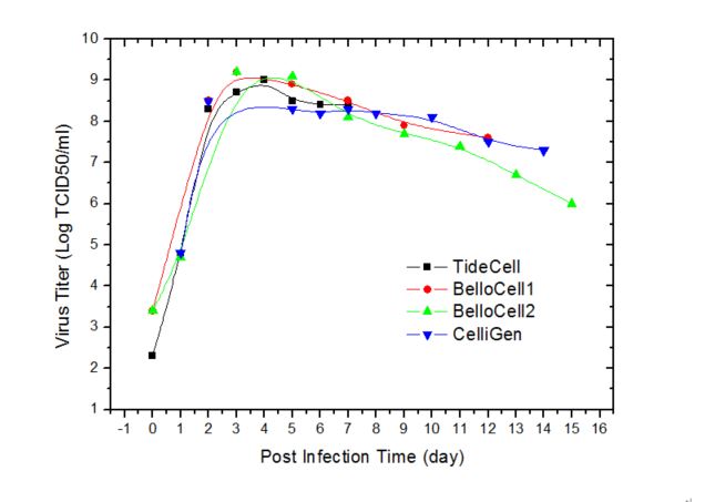 BelloCell with 500 ml working volume and TideCell-020 with 500 L working volume reaches similar virus output (Log TCID50: 9.2 in BelloCell, 9.0 in TideCell -020)