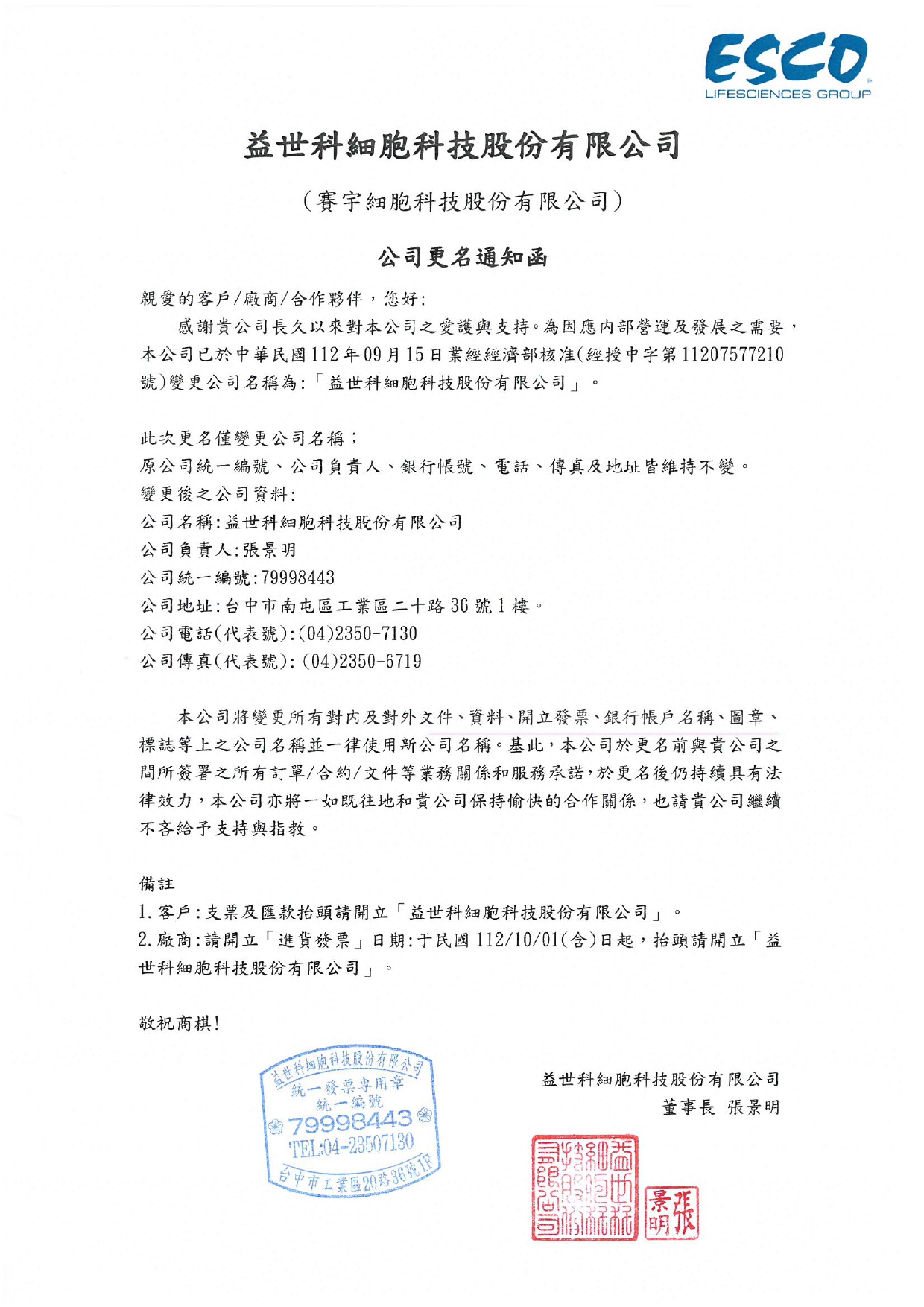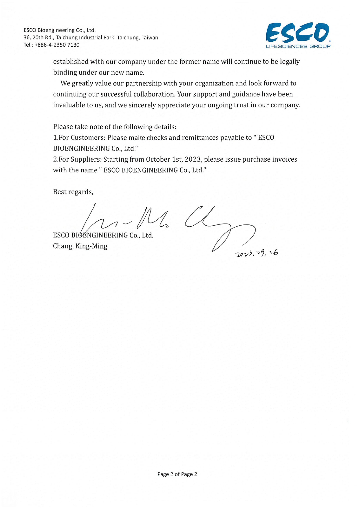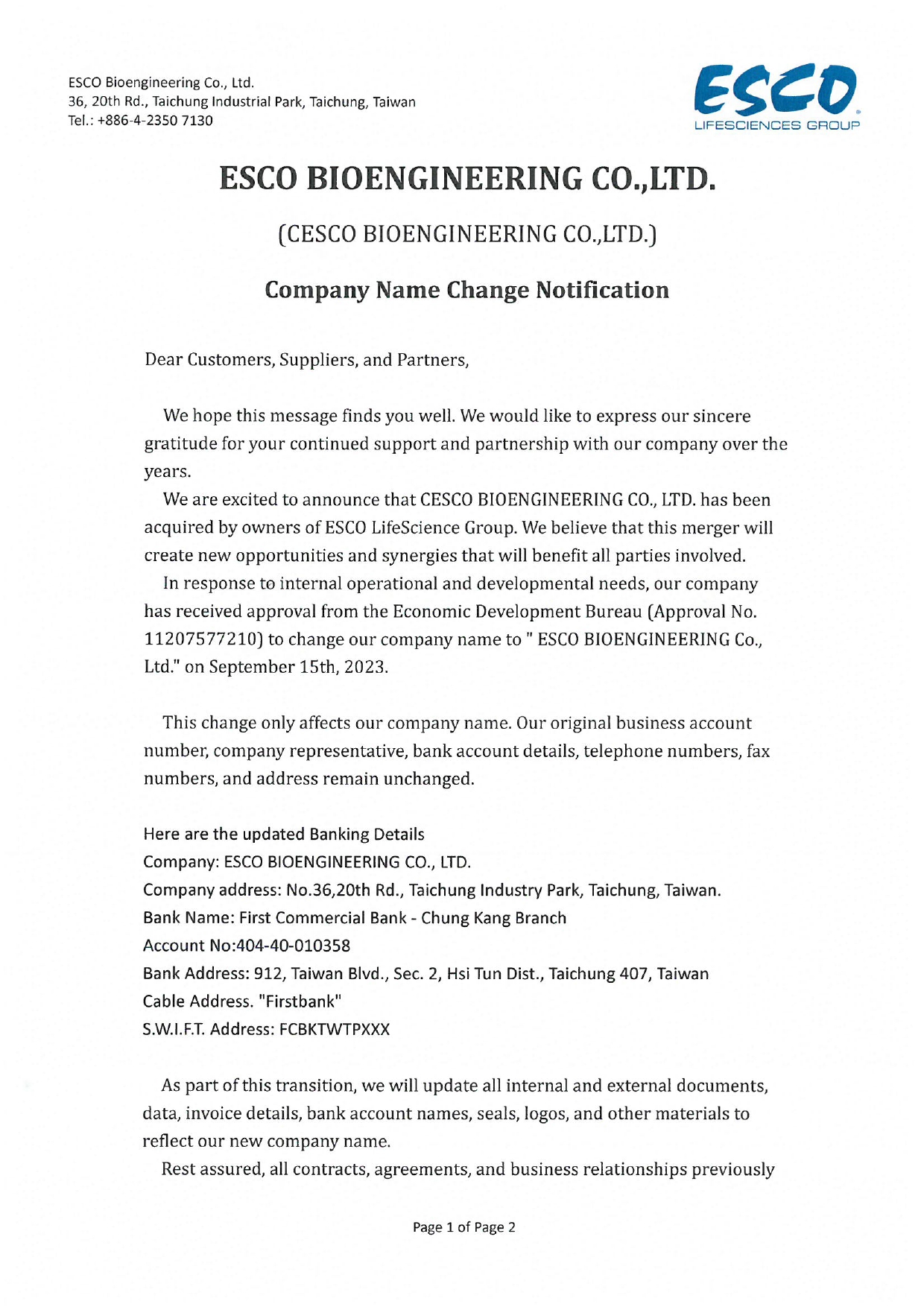 We hope this message finds you well. We are excited to announce that CESCO BIOENGINEERING CO,LTD. has been acquired by owners of ESCO LifeScience Group. This change only affects our company name, Our orignal business account number, company repersentative, bank account details remain unchanged.