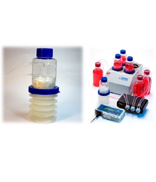 The principle of BelloCell-500P is to immobilize cells onto the BioNOC II matrices packed in its upper chamber. By compressing and decompressing the bellow of BelloCelll-500P by BelloStage machine, the culture medium inside rises and descends, submerging and exposing matrices periodically. During aeration, cells attached to porous matrices are exposed to the air through a thin liquid film. In the submerging phase, cells are in direct contact with the fresh medium for up-taking nutrients while metabolic waste can be diffused as well as CO2 can be exhausted efficiently. The concept of the design is to solve problems (shear stress, limited oxygen supply, and low cell density) frequently occurring on the commercial models, and to simplify the operation.