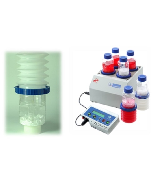 The principle of BelloCell-500A is to immobilize cells onto the BioNOC II matrices packed in its upper chamber. By compressing and decompressing the bellow of BelloCelll-500A by BelloStage machine, the culture medium inside rises and descends, submerging and exposing matrices periodically. During aeration, cells attached to porous matrices are exposed to the air through a thin liquid film. In the submerging phase, cells are in direct contact with the fresh medium for up-taking nutrients while metabolic waste can be diffused as well as CO2 can be exhausted efficiently. The concept of the design is to solve problems (shear stress, limited oxygen supply, and low cell density) frequently occurring on the commercial models, and to simplify the operation.
