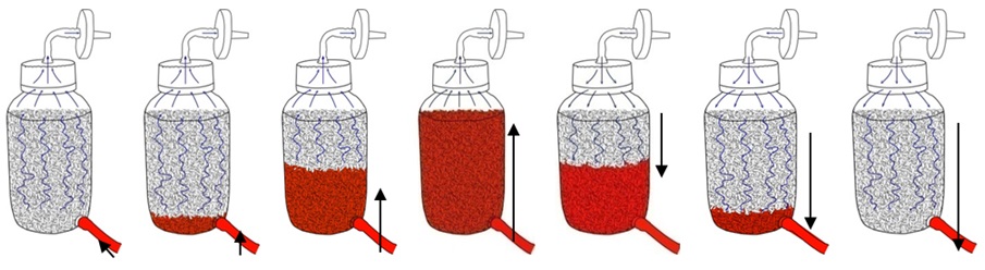 The culture medium in the external mixing bag, homogenized by different agitation methods, flows between the matrix vessel in the incubator and mixing bag by the switch-over of negative / positive air pressures, submerging the matrices where cells attach. As a result, the matrices are submerged and exposed to air periodically. During the submerging phase, fresh nutrients replenish, and metabolic wastes are diffused and then carried away. Meanwhile, the carbon dioxide is forced to exhaust. During aeration, clean air is introduced and contacts with the porous matrices through a thin liquid film. The oxygen transfer efficiency is maximized. The culture medium is re-mixed and tuning for pH/DO in the mixing bag.