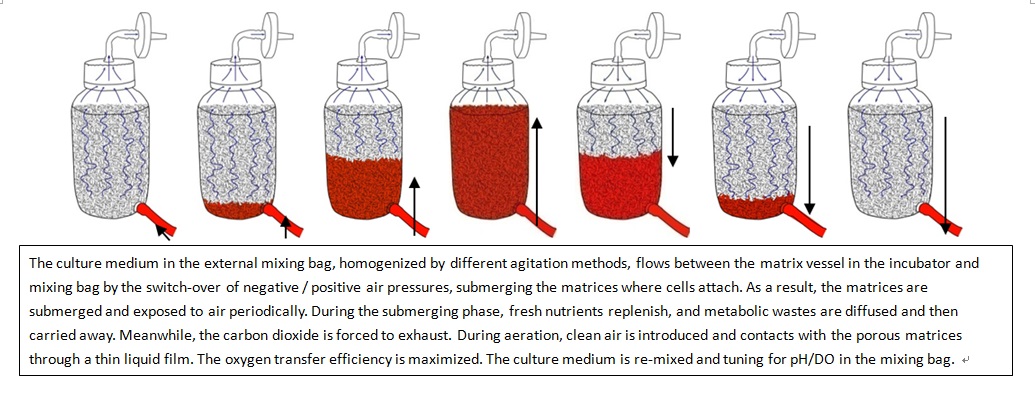 TideCellMatrix Vessel inherits the same patented principle of BelloCell bottles. Packed with porous BioNOC II matrices, the matrix vessel functions as an artificial lung with a huge contact surface for nutrition and aeration for cell culture. The culture medium is periodically drawn from the external medium bag (Mixing Bag) into the matrix vessel to submerge the matrices and withdrawn from the vessel to expose the matrices, driven by the applied air pressure. Thus, cells entrapped inside the matrices are able to receive sufficient nutrients and oxygen, while metabolic wastes such as lactate and carbon dioxide can be efficiently carried away in a gentle manner. The concept of the design is to solve problems (shear stress, limited oxygen supply, and low cell density) frequently occurring on the commercial models, and to simplify the operation.