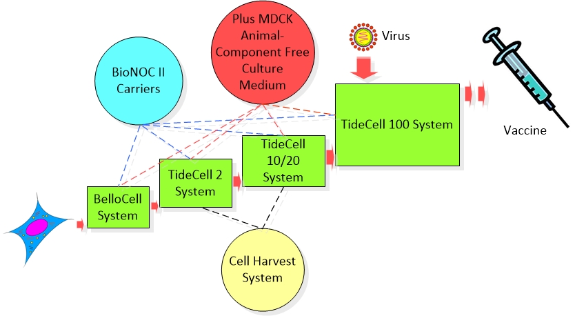 The MDCK-VIRUS Production Package (MVPP) consists the essential elements for mass production of virus from MDCK cells. The package includes animal component-free culture medium for MDCK cells, bioreactor from small to large scale (single-use or autoclavable), carriers, automatic seed preparation system, and relative protocols, documents and expertise service to shorten customer's time on process development and biological product manufacture.